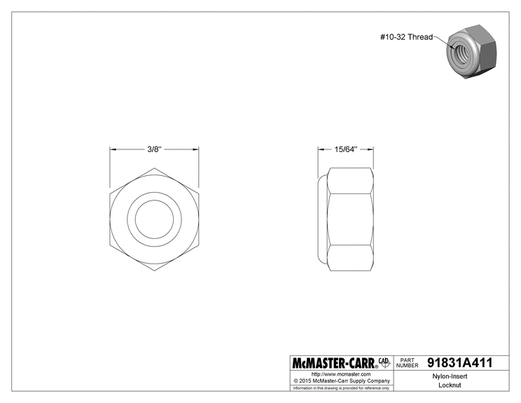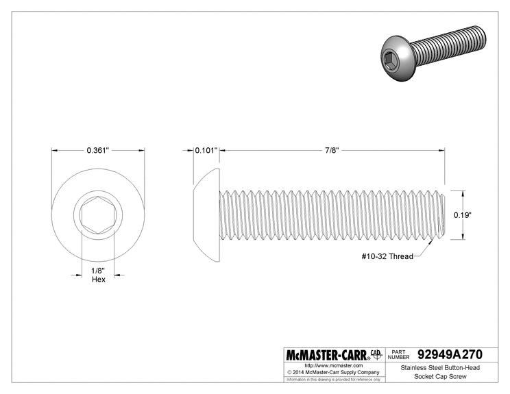 Machine screws, 10-32 Thread Size, 7/8" Long "Steel Button Head Hex Drive Screw" - McMaster #92949a270 Matching nuts, 10-32 Thread Size, Stainless "Steel Nylon-Insert Locknut" - McMaster #91831a411
