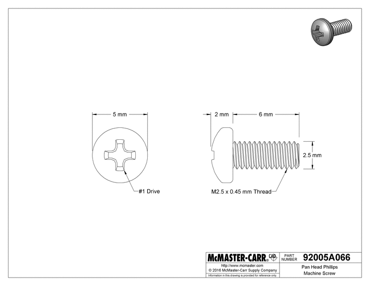 G: [Qty:12] M2.5 x 0.45 mm Thread, 6 mm Long "Steel Pan Head Phillips Screw" - McMaster #92005a066