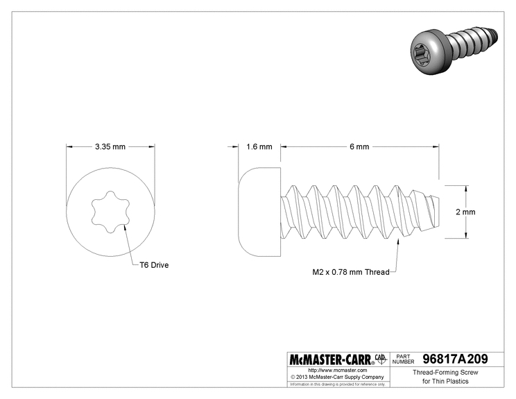 F: [Qty: 6] Delta PT screws M2.0 x 6 mm Long "Thread-Forming Screws for Thin Plastic" - McMaster #96817a209