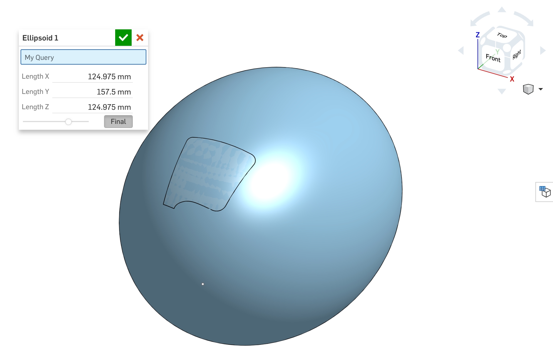 What may seem intimidating at first is conceptually very simple. One property of elipsoids is that all the light emitted from one focus reflects off its surface and focuses it to the second focus! Amazing. Therefore, to figure out the section of elipsoid needed in our AR application, we traced a ray backwards from the second focus, through a cellphone-sized.