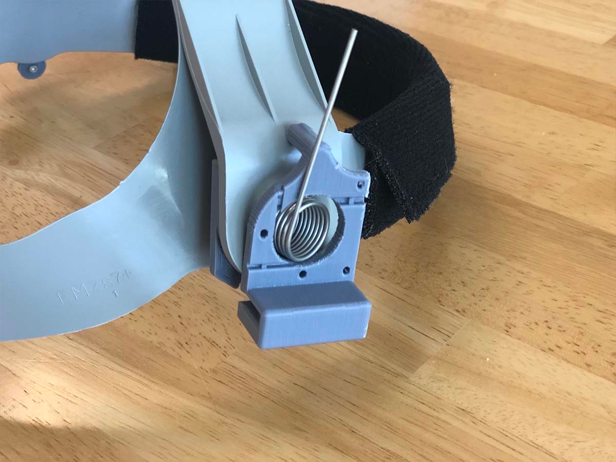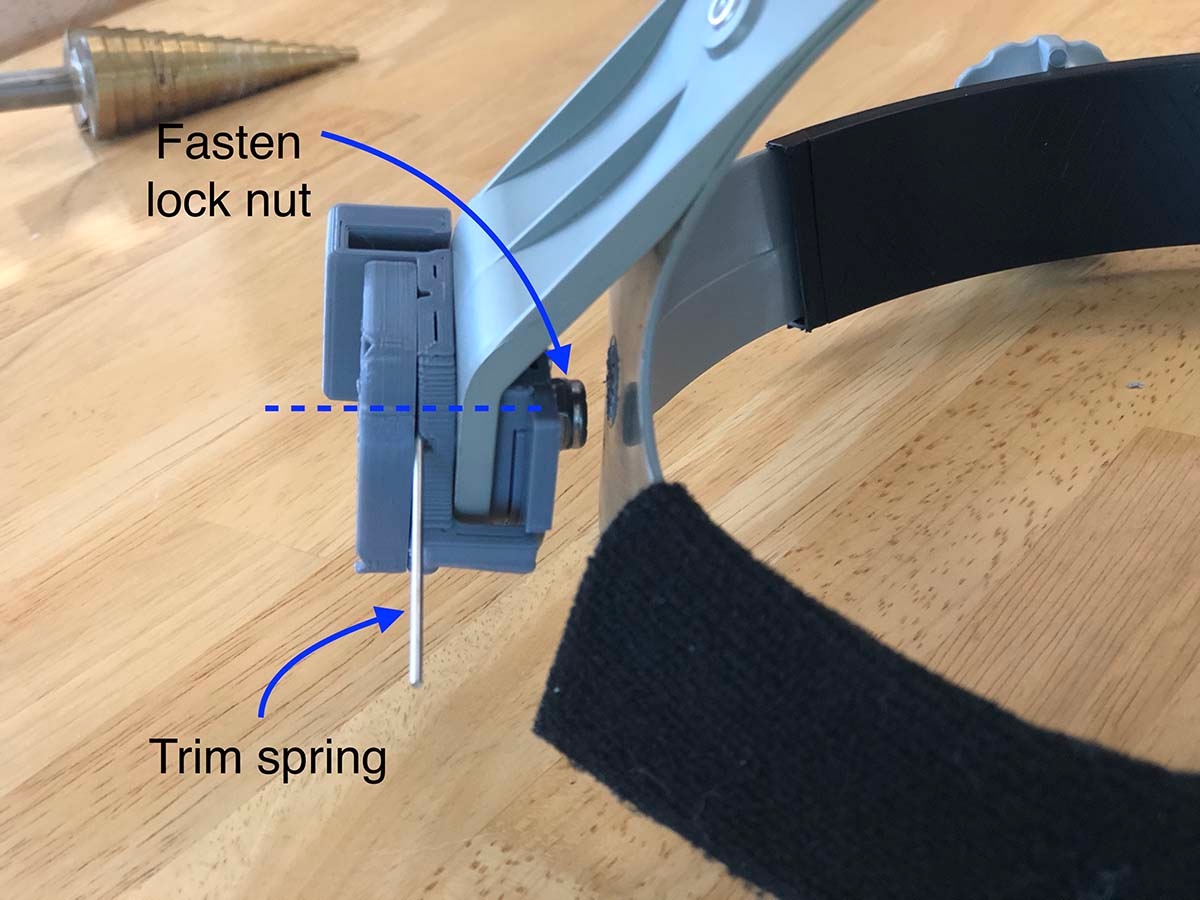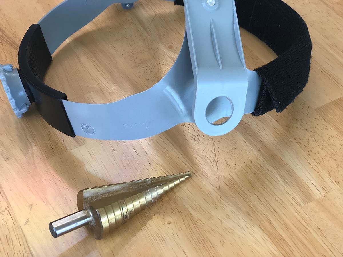 1) Remove the mounting assemblies on both sides of the headgear, enlarge hole to 18mm. We used a stepped drill to enlarge the hole, a little larger than the diameter of the spring we’re using.
