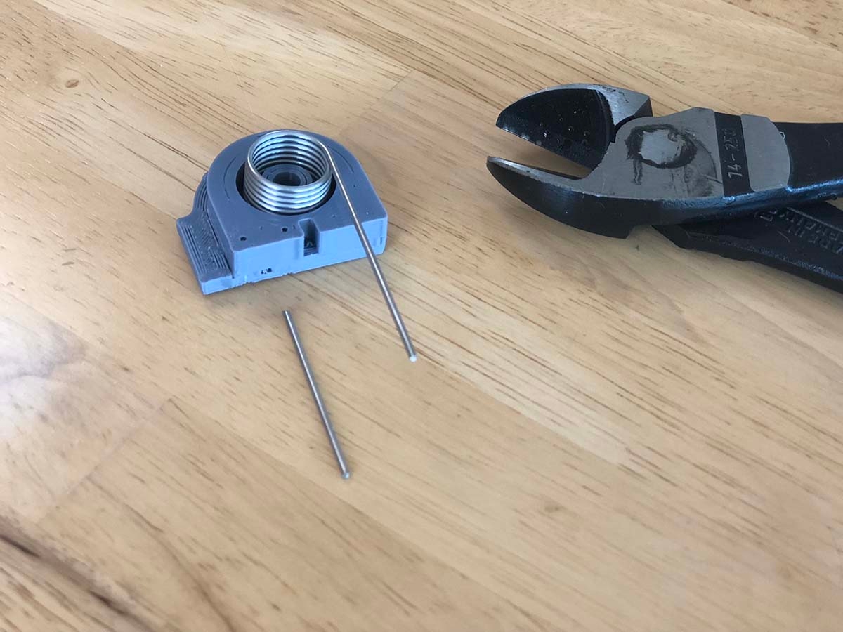 2) Place matching spring into rear housing, fasten close, and trim spring legs.