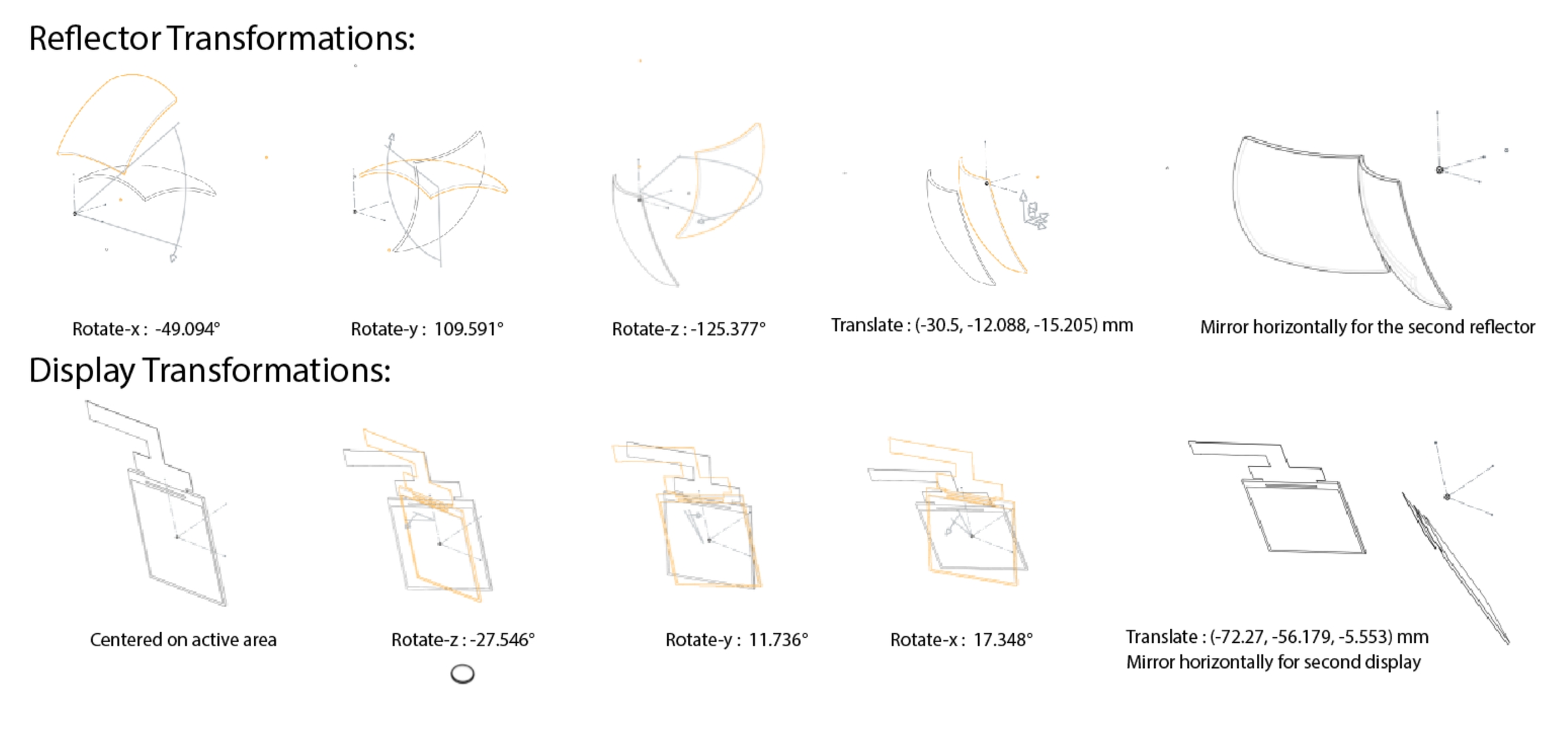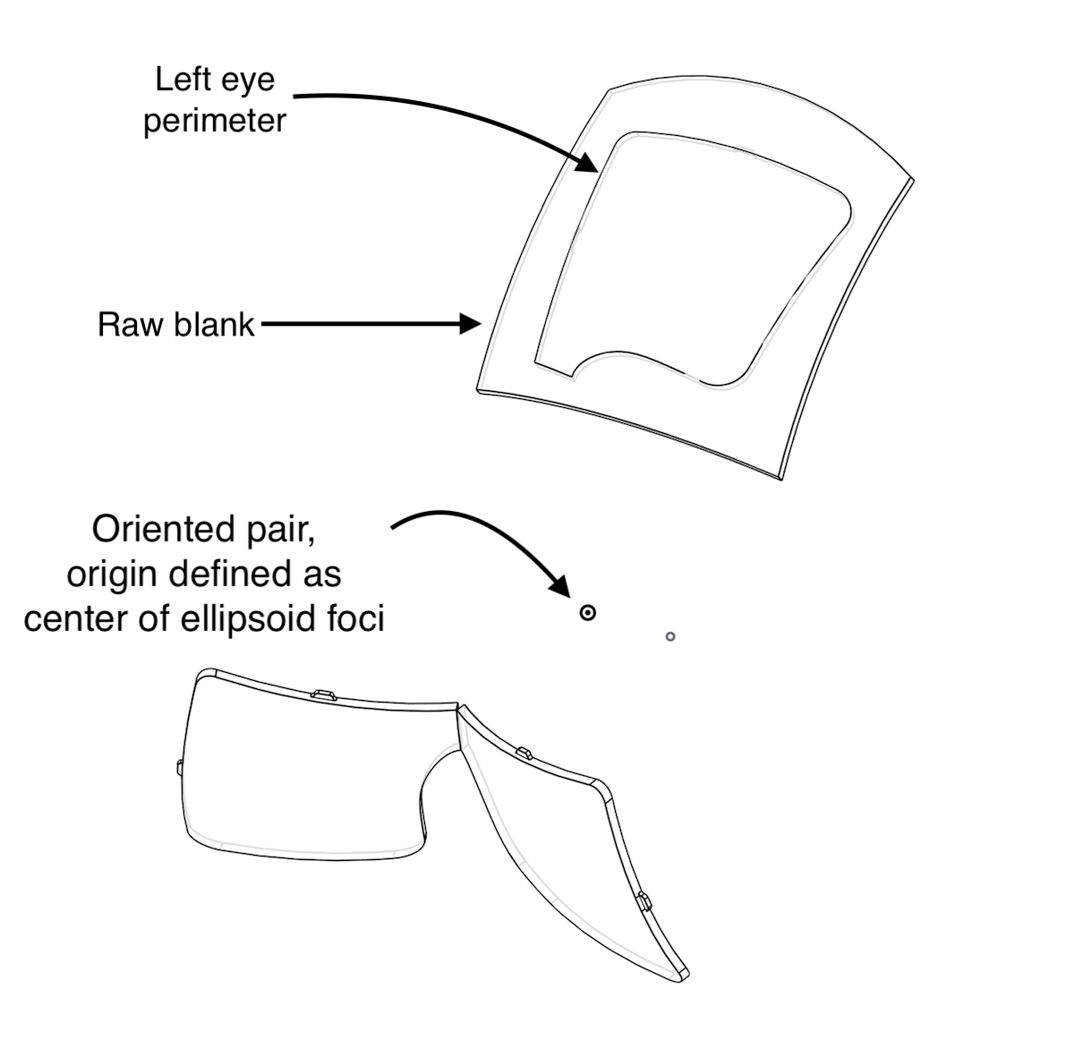 From the elipsoid definition, the reflectors need to be rotated and translated into position. We define the origin point as the midpoint between the two reflector foci, which should line up with the user's pupils: