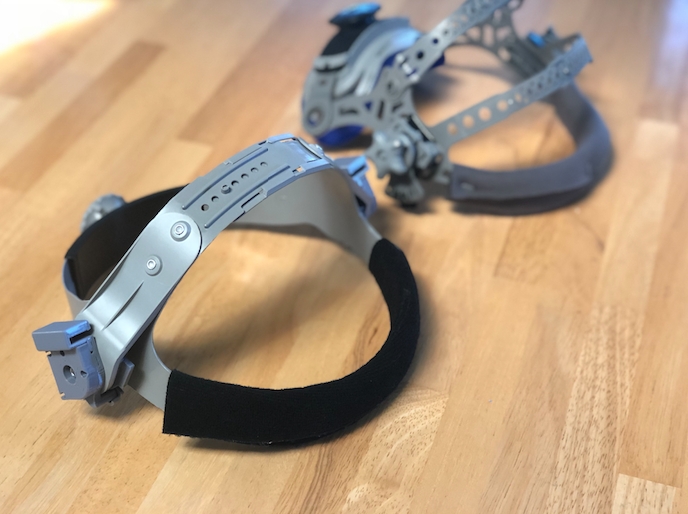 Light and adjustable with rigid mount points. Several welder's mask headgear vendors were tested, but most failed to be rigid or comfortable for our applications. Their general design is made of injection-molded plastic features that tighten onto either side of a welding faceshield. Although it may be desireable for those features to be flexible and compliant for welding, our heavier AR assemblies caused the headgear to flex and/or dig into the users' head. Ouch. The following Miller branded model's had very little flex and generally comfortable. It really helps they're lightweight as well.