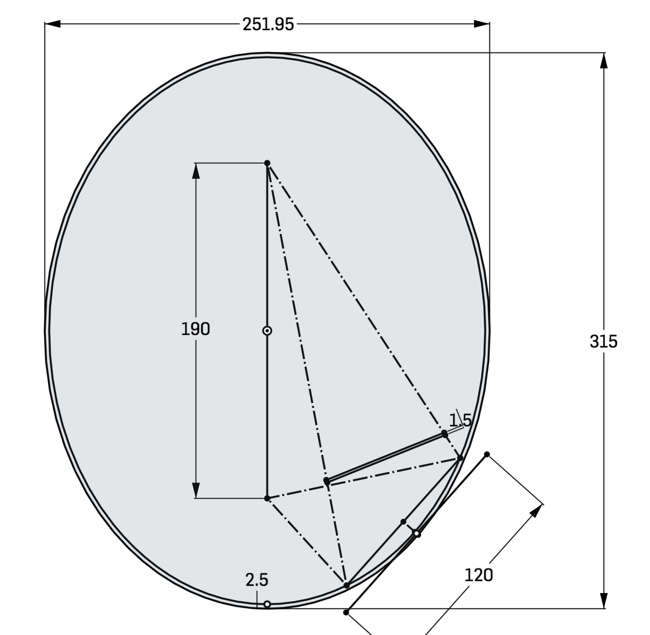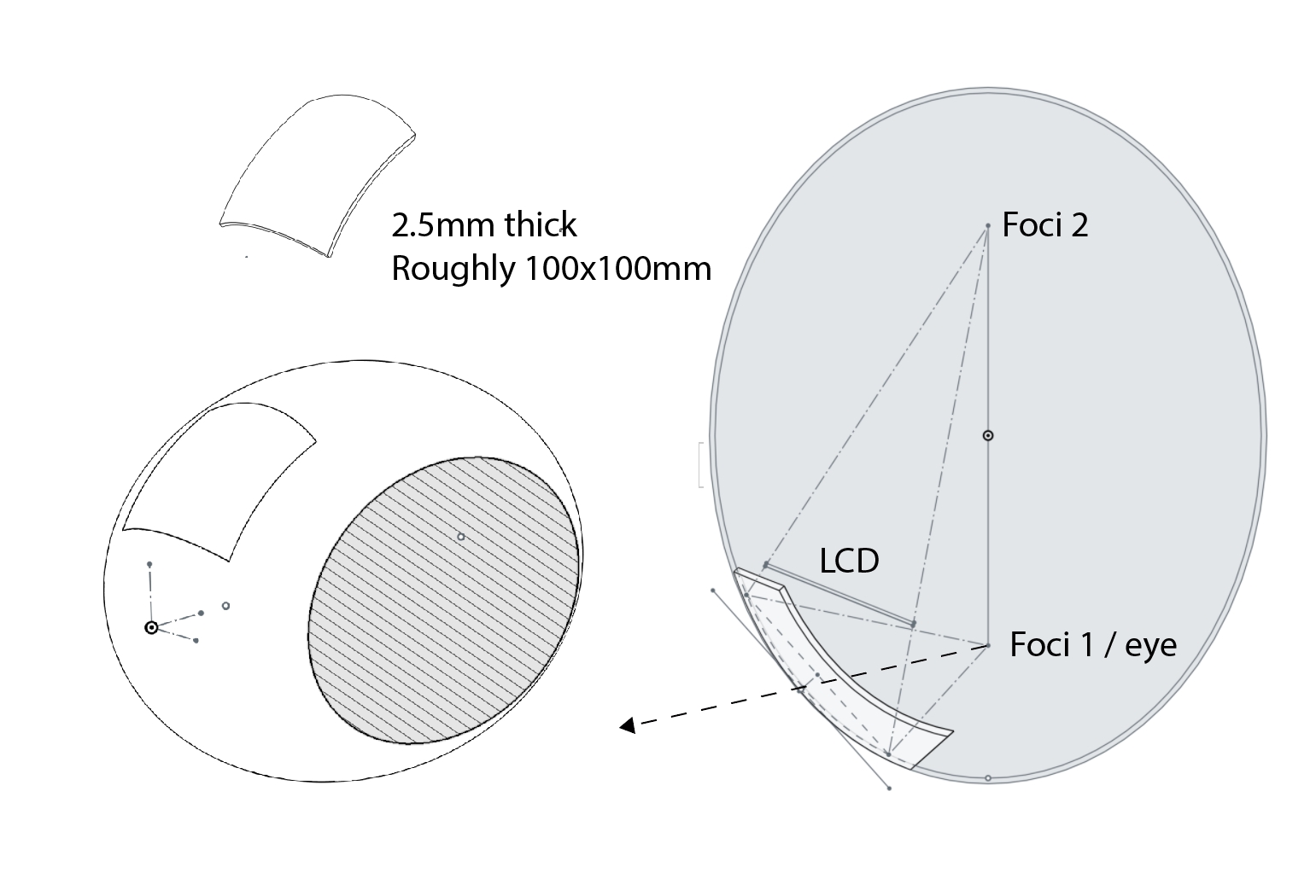 The resultant elipsoid is defined by the following dimensions, chosen to allow a range of 3-to-5-inch LCD panels to be placed near the eye. The perimeter of the elipsoid section was decided on empirically by minimizing distortion with a larger prototype, then cropping to the reflected image. This large reflector was roughly 120x120mm, and the final ended up being around 75x75mm.