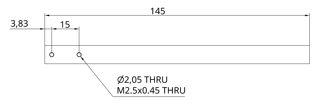 Cut, drill, and tap the slides to roughly 150mm (6 inches) in length. We used a Dremel rotary tool to cut the bar stock to length, and transferred the hole pattern from the Halo 3D print using a transfer punch. The two holes are tapped using M2.5 x 0.45 mm Thread Tap, McMaster